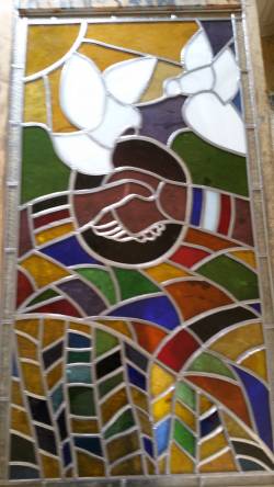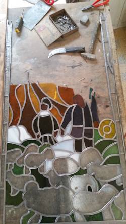 Durant l'été 2016, le verrier, Jean-Claude Delorme, découpe chaque verre de couleur suivant les dessins des élèves puis il les sertit, met en place le plomb, le soude, mastique, passe du Blanc de Meudon et laisse sécher.